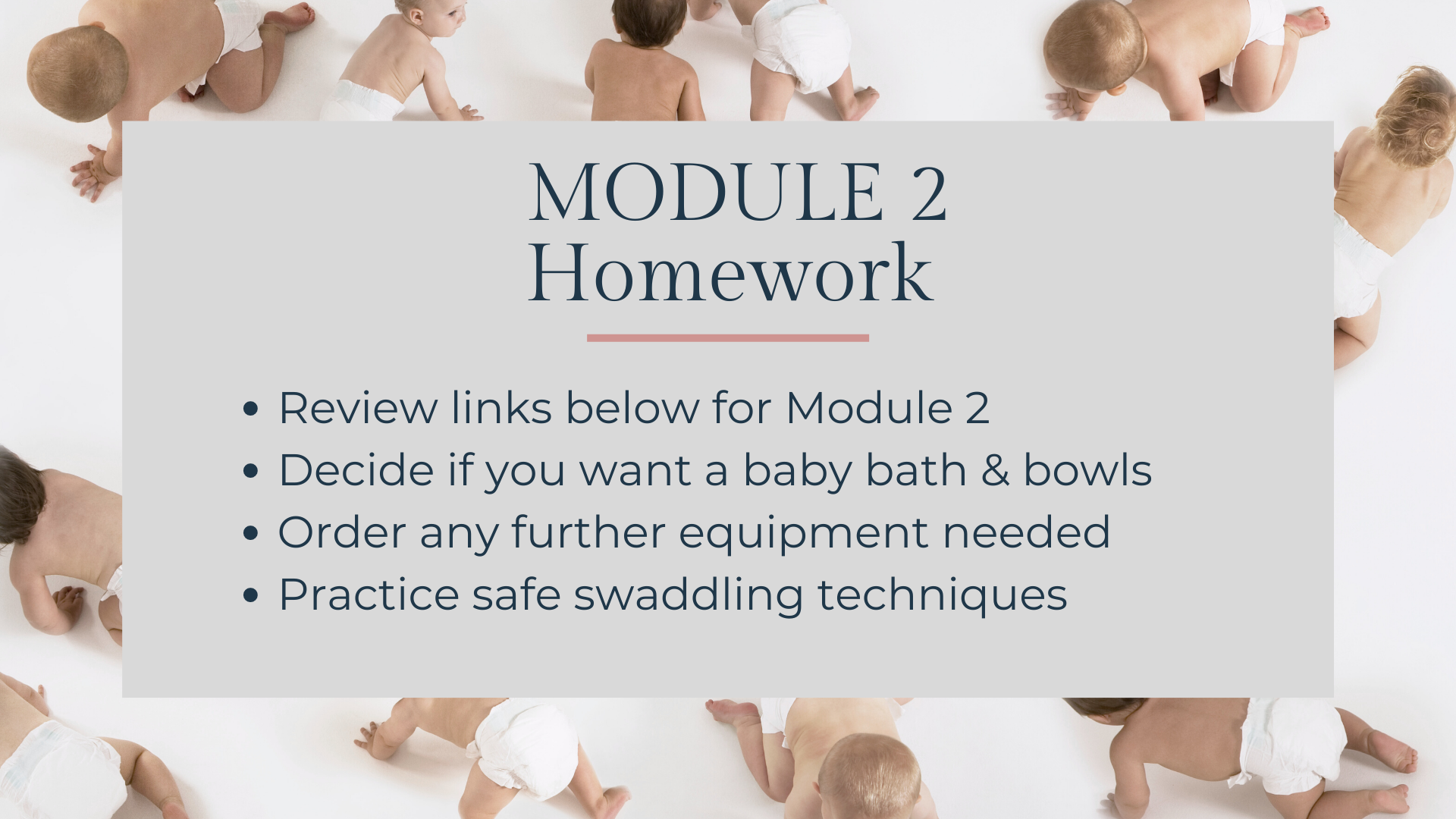 This module we learnt all about bathing and dressing babies and we started to explore comforting measures. We will dive deeper into comforting and soothing babies next week when we also learn all about feeding and sleeping.