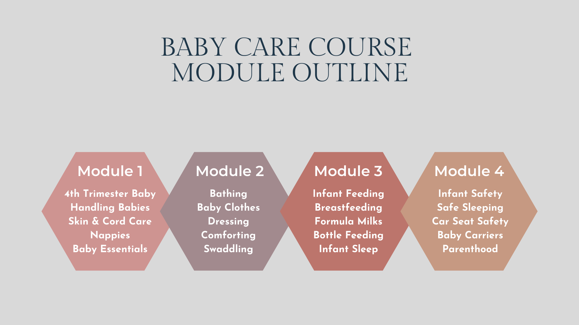 For each module there is a presentation as well as lots of follow up practical video guides. These are for specific areas of ‘hands on’ baby care such as nappy changing, swaddling, bathing etc. I hope you enjoy joining in where possible!